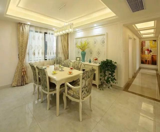 餐廳與客廳沒有明顯劃分,色調(diào)延續(xù)了客廳的主調(diào),同樣的背景墻紙加上同樣的窗簾,連家具都是跟客廳配套的。一致的風格才能讓整個空間更具整體性。窗簾與家具都是業(yè)主專門訂做的,花費了女主人不少心力。