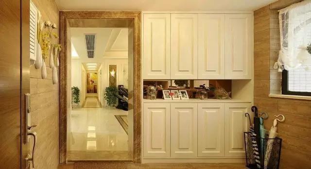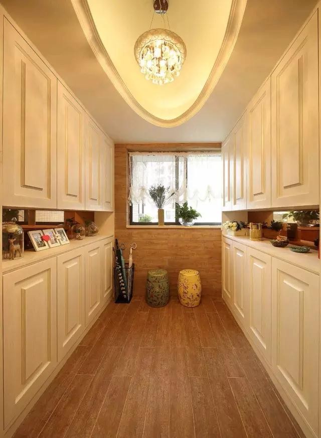 兩排大大的儲物柜極大地滿足了一家人對儲物的需求,中間鏤空的部分被女主人拿來擺放一些照片和隨手買的小物件。歐式的門板與上面的歐式天花造型相呼應,簡約大氣的感覺。