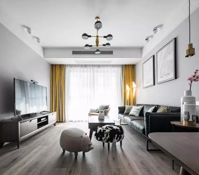 金色燈具和黃色窗簾的點綴,讓空間的節(jié)奏更有韻律。
