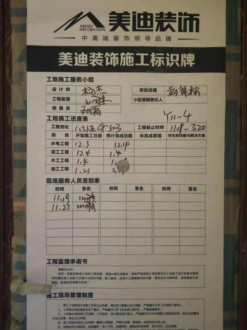 一進(jìn)門我們可以看到《美迪裝飾施工標(biāo)識(shí)牌》,上面記錄了各項(xiàng)施工階段的起始時(shí)間和驗(yàn)收時(shí)間等。業(yè)主只需要通過這張表,就可以得知自己家的裝修已經(jīng)進(jìn)行到哪一步。