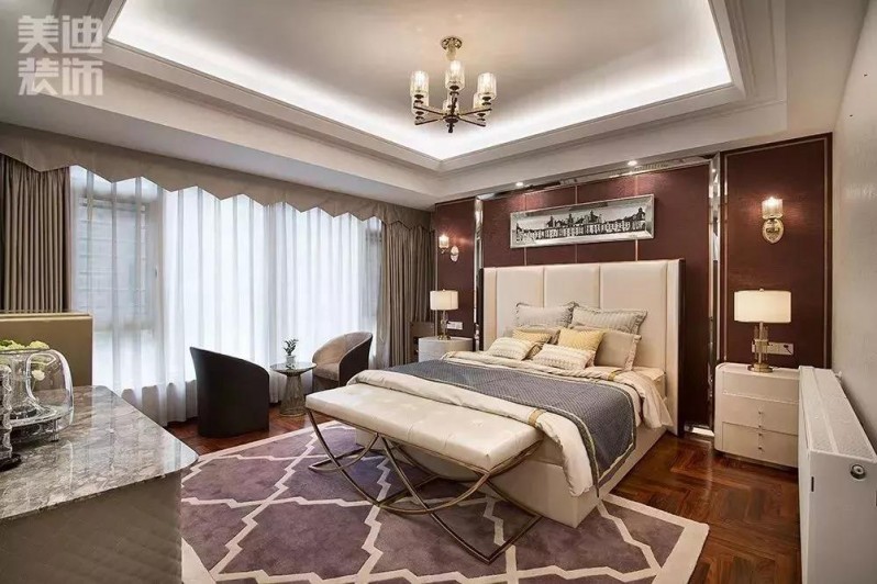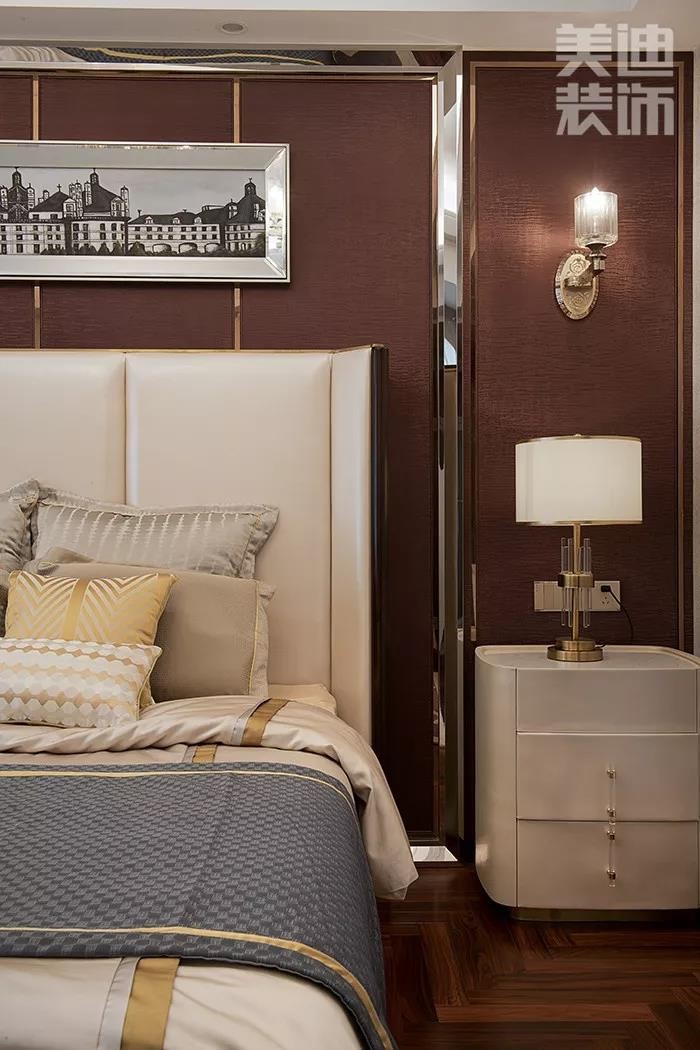 主臥室采用了暖色系,巧妙的加入金屬材質(zhì)、卡其色元素,實木拼接地板,線條簡單的家具,錯落有序,營造出一個溫馨舒適的休息空間。
