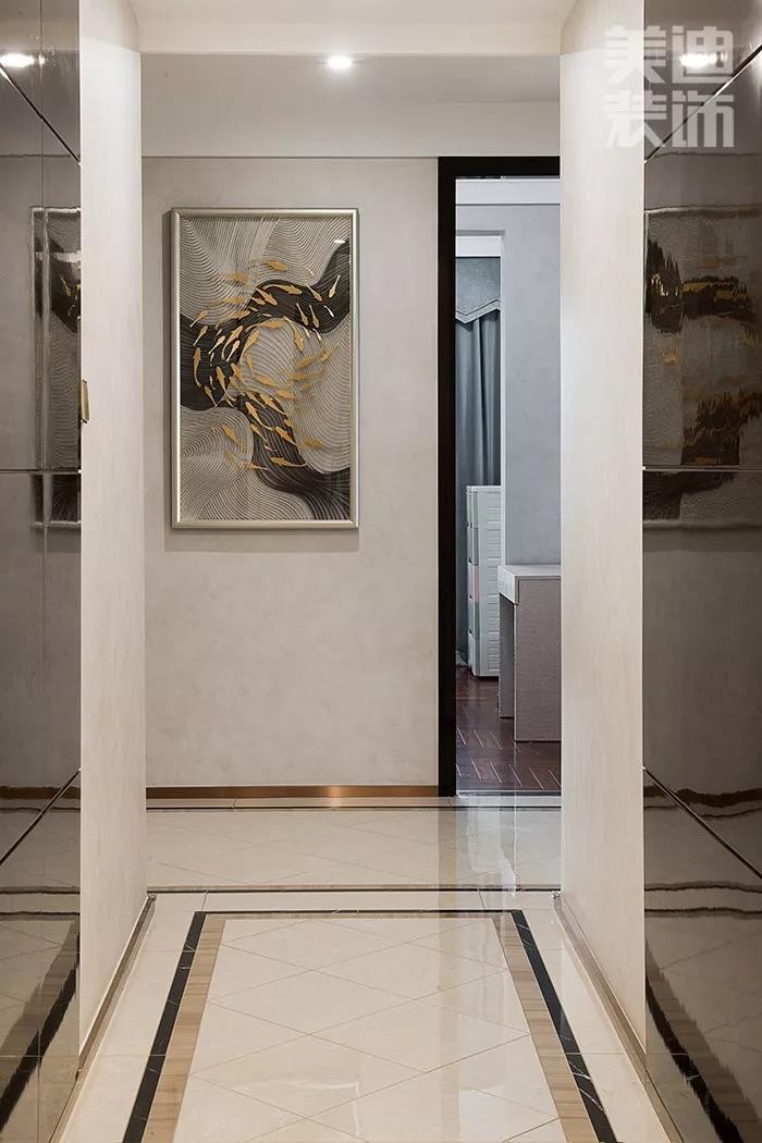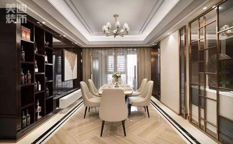 本次案例精彩的地方推開門就能看到,與餐廳連接的墻面特地做了一個鏤空的金屬隔斷,從而延伸了餐廳的空間,盡頭放置精致高雅裝飾柜,整體生動且時尚別致,強大的收納設計使整體實用且明亮寬敞。