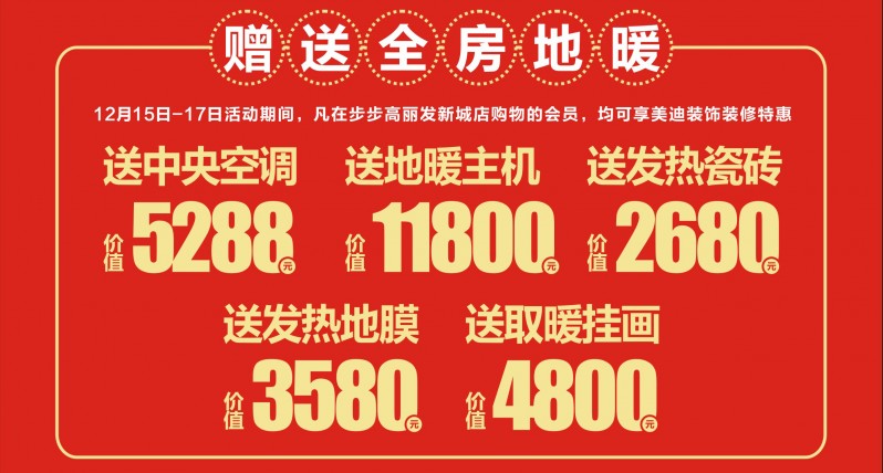 來(lái)美迪裝飾定裝修還送全房地暖:中央空調(diào)、地暖主機(jī)、發(fā)熱瓷磚、發(fā)熱地板、取暖掛畫(huà),每戶(hù)立省2-8萬(wàn)元,全年度優(yōu)惠力度最大。