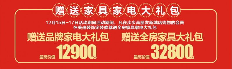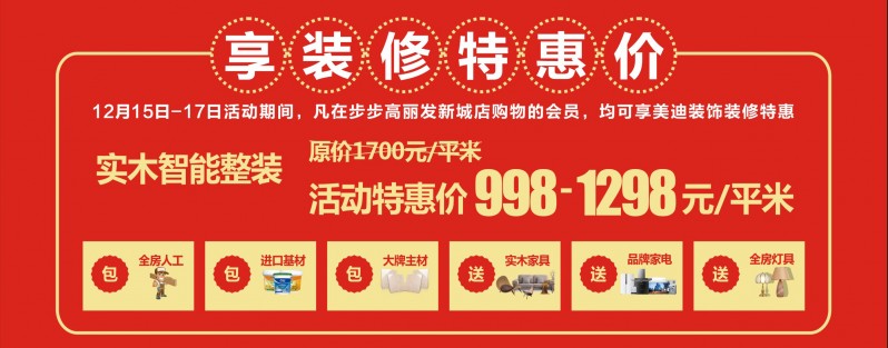 活動(dòng)期間(12月15日-17日),凡在步步高麗發(fā)新城店購(gòu)物的會(huì)員,均可享美迪裝飾裝修特惠價(jià)998-1298元/平米,并且承包你家的全房人工、全房燈具、進(jìn)口基材、大牌主材。
