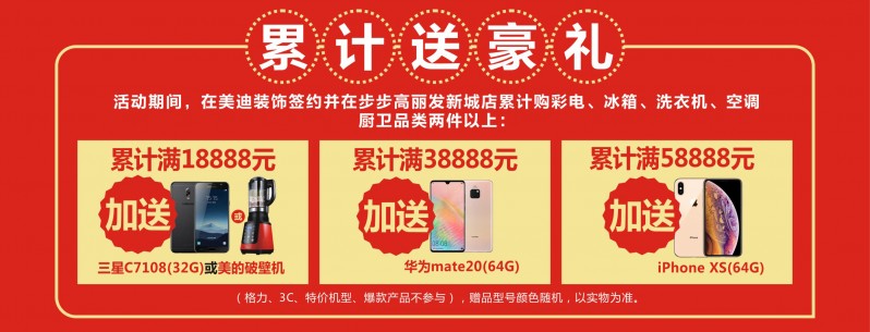 活動(dòng)期間(12月15日-17日),在美迪裝飾簽約并在步步高麗發(fā)新城店累計(jì)滿18888元加送三星手機(jī)或美的破壁機(jī),累計(jì)滿38888元加送華為mate20(是64G的哦~),累計(jì)滿58888元加送iphone XS!!!