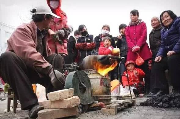 一個黑乎乎的鍋放在火上,一個人輕輕地搖動著手柄,旁邊排著長長的隊,不一會兒就聽“咚”的一聲巨響,如炸雷一般,見到爆米花,就預示著新年快到了。