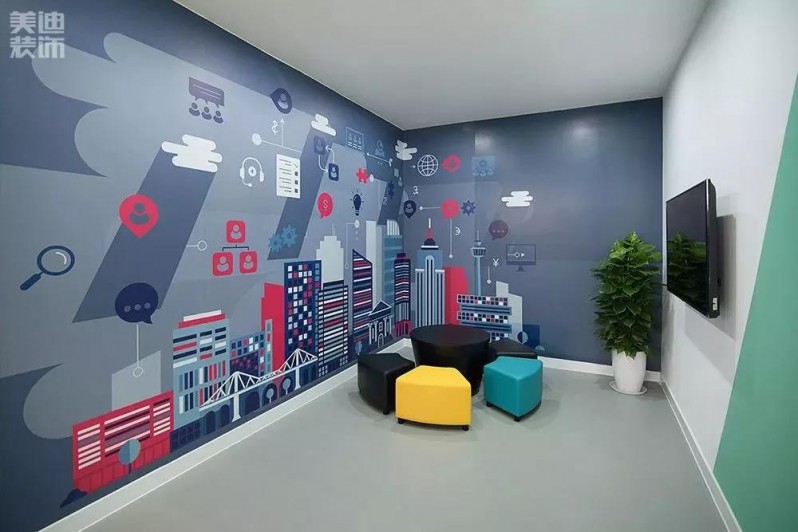休閑區(qū)的設(shè)計(jì)富有趣味,彩繪的墻面、綠植帶來好的心情,給帶小孩的顧客提供玩樂空間。