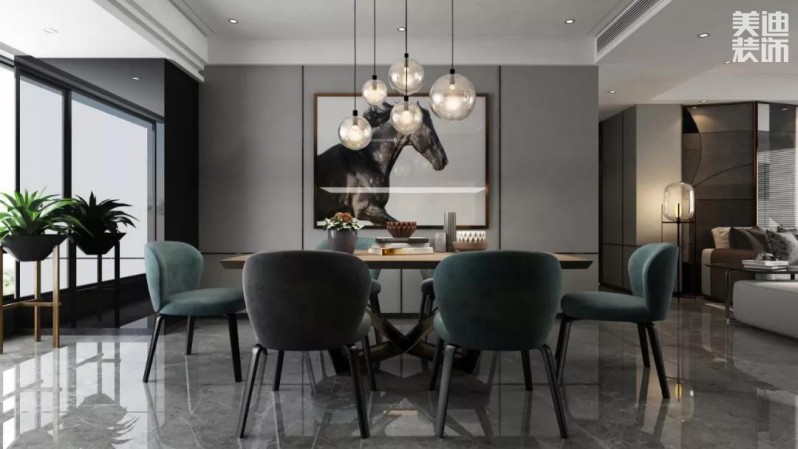 本案是一套面積為120平米的現(xiàn)代輕奢風(fēng)格三居,整體以高級(jí)灰色調(diào)為空間的主軸線,貫穿每個(gè)空間,孔雀綠的點(diǎn)綴賦予了空間層次感與輕奢感,冷靜低調(diào)而優(yōu)雅簡(jiǎn)約。