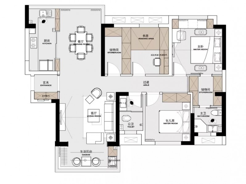 本案空間北面的空間劃分改動(dòng)不比較大,北邊小陽(yáng)臺(tái)兩邊墻體拆除,餐廳外擴(kuò),陽(yáng)臺(tái)空間全部納入到餐廳,借用了廚房墻體空間制作酒柜,客廳南面的大陽(yáng)臺(tái)我們直接把他歸納到了客廳的公共區(qū)域,增加了客廳的采光及空間。