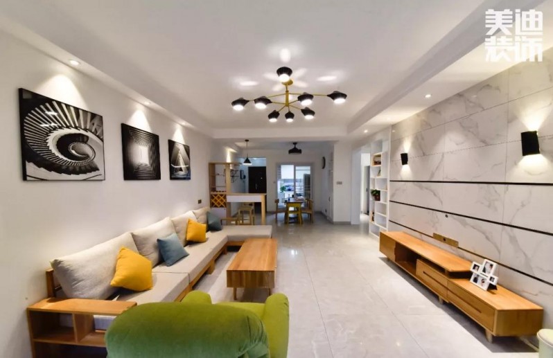 天花方面,沒有繁復(fù)的吊頂,結(jié)合爵士白大理石電視背景墻,一套布藝沙發(fā)和一個(gè)木質(zhì)小茶幾,把極簡空間裝扮的簡單大方的氛圍。