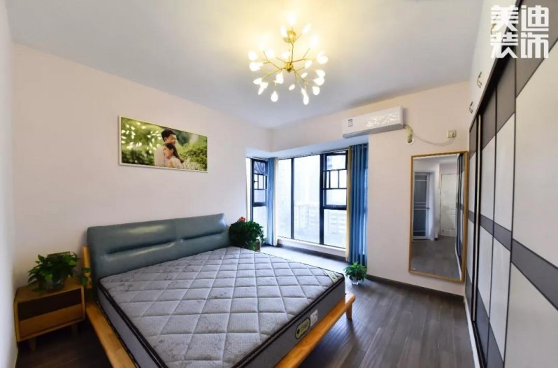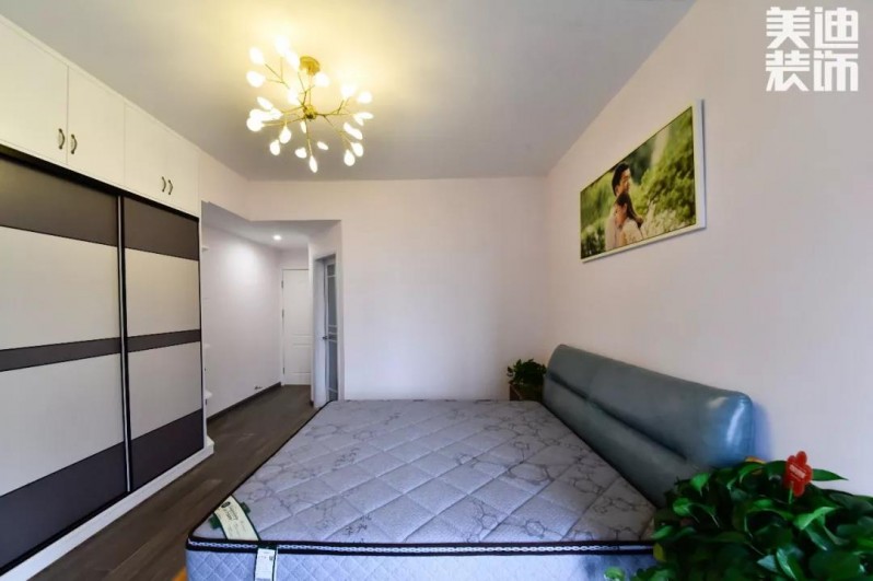 臥室沒有做繁復(fù)的吊頂。天花板和墻面做簡潔處理,利用燈光和些許飾物做搭配,清爽宜人,創(chuàng)造出臥室最佳的氣氛。