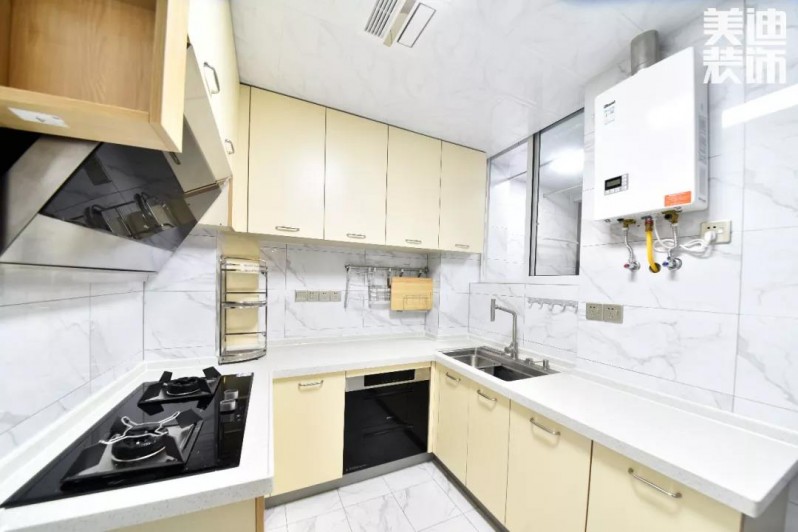 廚房關(guān)上玻璃門就可以隔絕油煙,烹飪區(qū)和洗菜池合理區(qū)分,日常使用起來會(huì)更方便。純白+原木櫥柜配色,清爽無比,做起菜來也會(huì)心情好好。