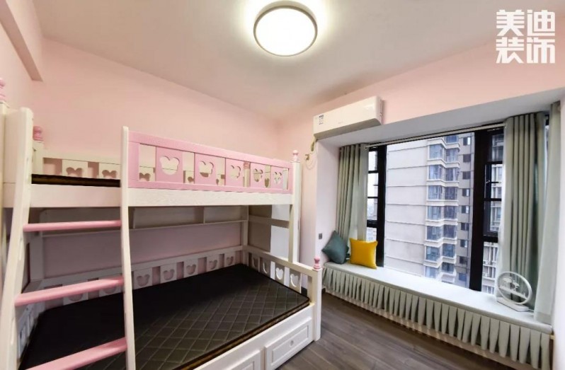 因?yàn)榧依锏男∨笥堰€小,兒童房還沒正式開始裝扮,但是粉色的上下床,落地窗增加的飄窗柜,有足夠的空間供小朋友學(xué)習(xí)和玩耍。