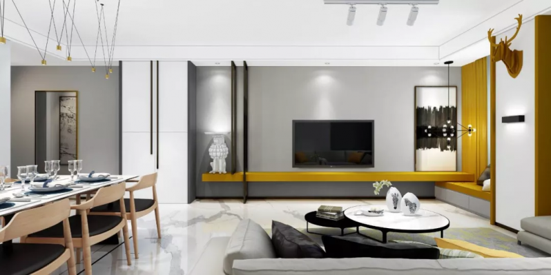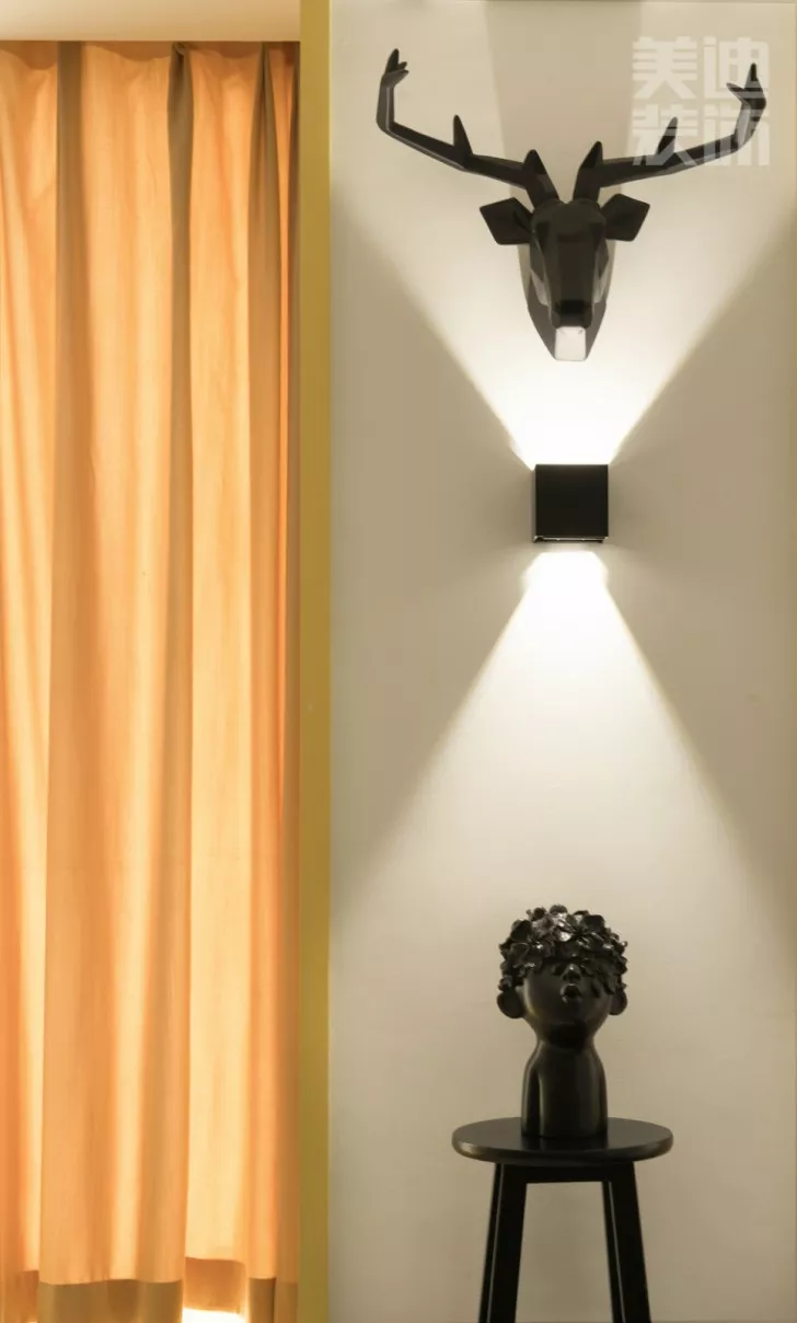 在客廳右側(cè)的燈和鹿頭這一套擺飾,我和設(shè)計師跑了N次市場,搜遍N家電商平臺,才確定用這一套擺飾!