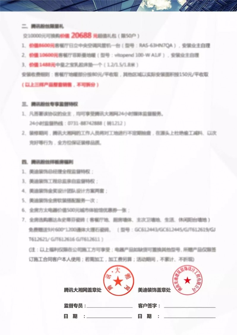 簽約即享騰訊大湘網(wǎng)權(quán)威監(jiān)督特權(quán),簽署騰訊粉絲專屬樣板房協(xié)議,享受騰訊大湘網(wǎng)24小時媒體監(jiān)督服務(wù),全程為您保駕護(hù)航。
