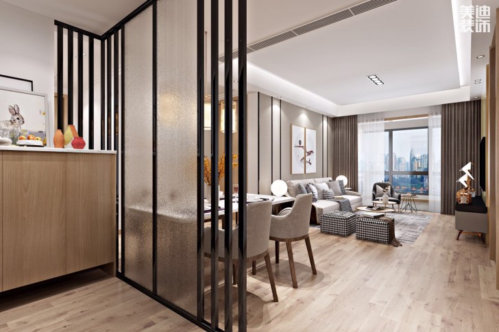 注重空間的流暢與分隔,為了做到“麻雀雖小,五臟俱全”,空間分隔是必不可少,而推拉門這個(gè)時(shí)候就可以發(fā)揮它的作用。