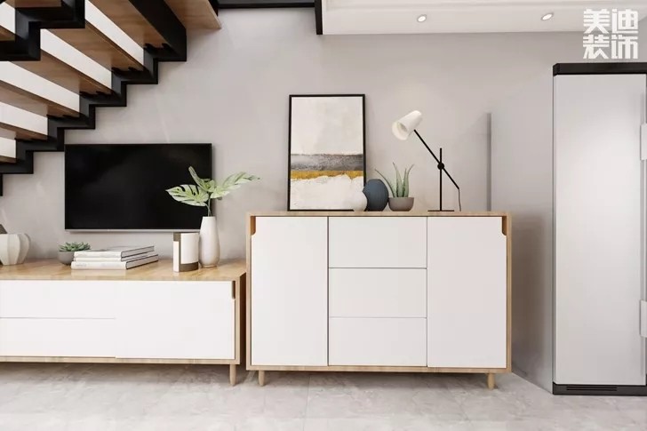 把電視柜做為一個裝飾柜,或者一個展示柜來使用,在增強客廳美觀程度的同時,將客廳的收容性質(zhì)做到更大。