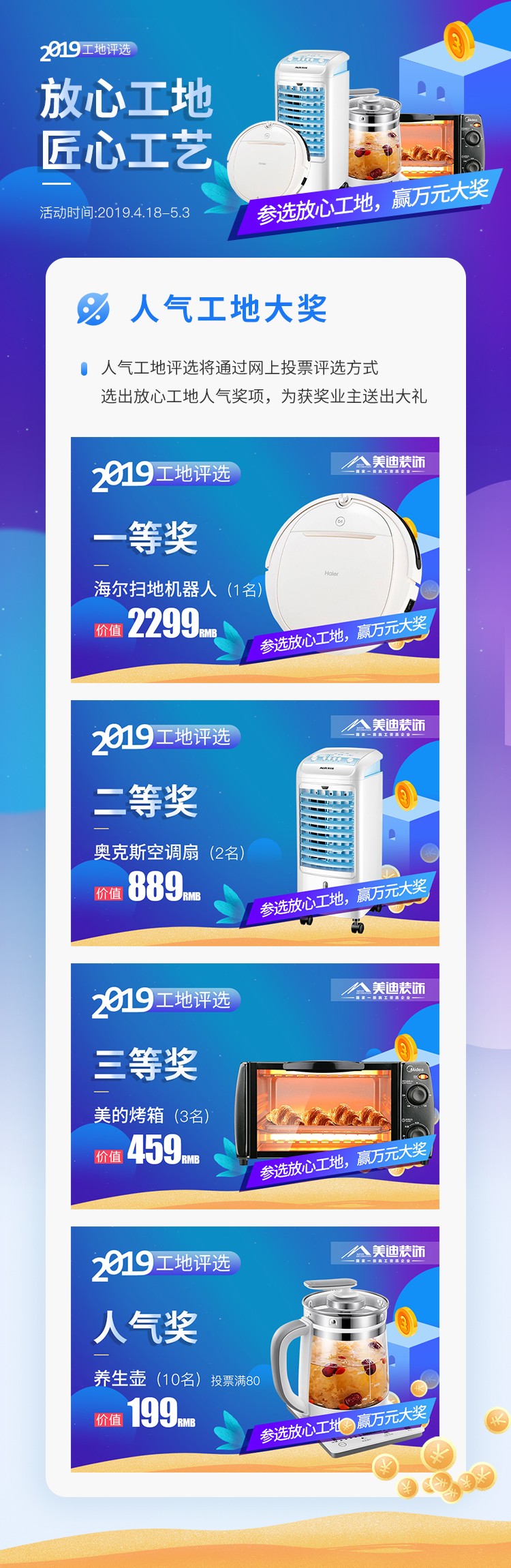 我們希望通過工地展示和評選的方式,喊大家一起來監(jiān)督美迪品質(zhì)工程啦!同時為感謝業(yè)主的放心選擇,參選放心工地投票,還能贏大獎呀!