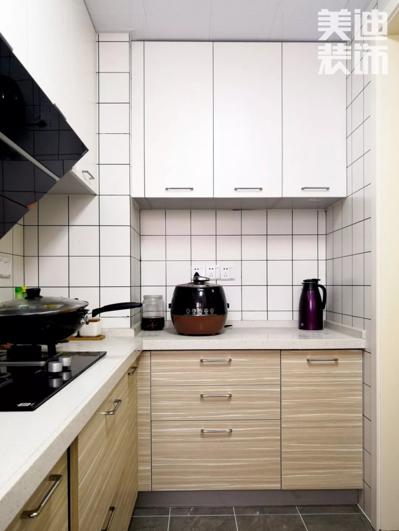 廚房的設計收納更把收納發(fā)揮到了極致,廚房的面積并不算大,但經(jīng)過設計師的打造,空間感瞬間就提升了上來,頂端和柜臺下面都安放儲物柜,整潔大方。