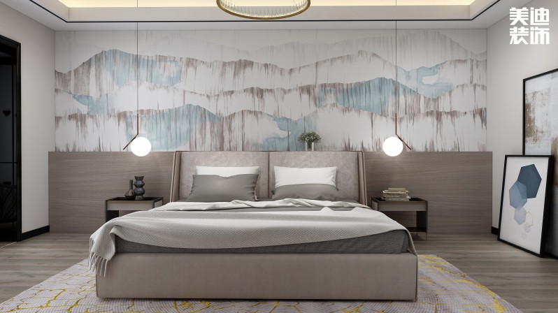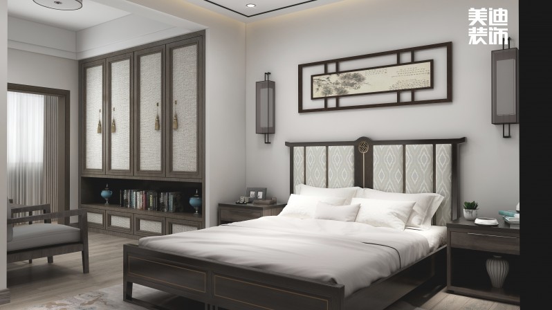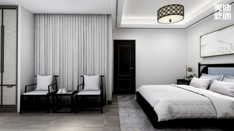 臥室區(qū)使用島式燈槽吊頂劃分臥室與休閑區(qū)的關(guān)系,老人房和客房的設(shè)計(jì)用咖啡色、原木色等看起來柔和、樸素寧靜的色調(diào),不僅十分的舒適,還讓人感到平和寧靜。