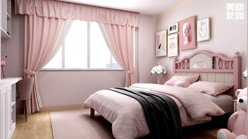 女孩房整個(gè)空間用的是粉色系,滿足小女孩的公主夢(mèng),這種夢(mèng)幻風(fēng)格的格局透露出來的小清新氣息讓人心情舒暢,更顯得天真、可愛、純真。