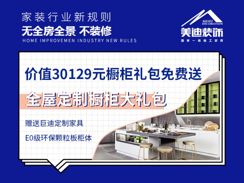 家裝行業(yè)新規(guī)則,無全房全景不裝修。價值30129元櫥柜禮包免費送,全屋定制櫥柜大禮包,贈送巨迪定制家具,E0級環(huán)保顆粒板柜體。