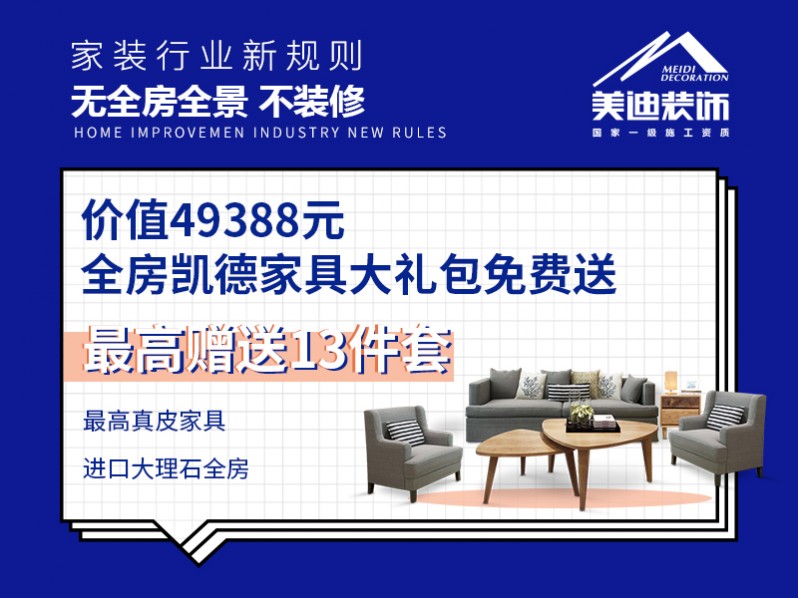 家裝行業(yè)新規(guī)則,無全房全景不裝修。價值49388元,全房凱德家具大禮包免費送,最高贈送13件套。