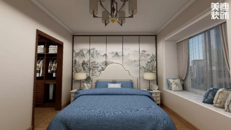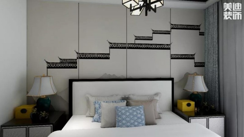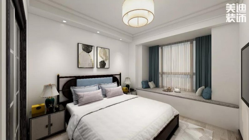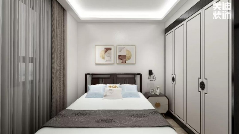 何英設(shè)計師這套新中式風(fēng)格空間以清新秀雅為主,沒有笨重的紅木家具,客餐廳背景的墻古風(fēng)掛畫跟實木的家具融合在一起,獨具一格。臥室的格調(diào)比客廳要簡約一些,用直線條來提高空間的條理性和通透性。