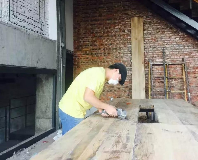 還有店里的大板桌、茶幾、書架,也全是他們一個個從鄉(xiāng)下的木材市場和舊木市場淘回來,再去開料,去皮,打磨,拼裝、刷漆,每一個物件都是他和客戶的心血。