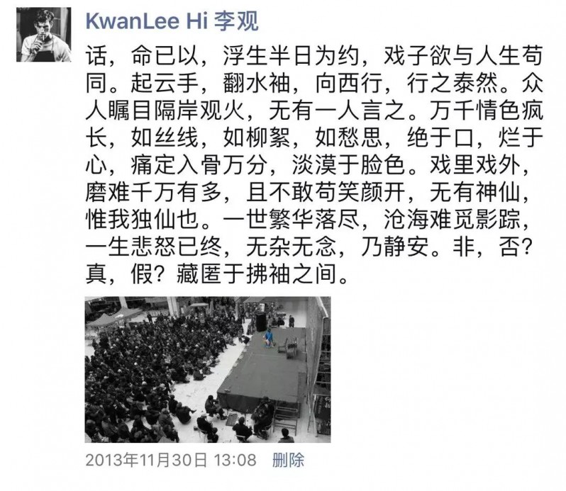 “有一天在朋友圈看了這張黑白圖片,只有臺上的戲子穿著戲服是彩色,頓時感覺臺上的戲子也許和我當時的心境是一樣的:戲子的人生有兩種,臺上扮演的是一種,臺下的自己的是一種。