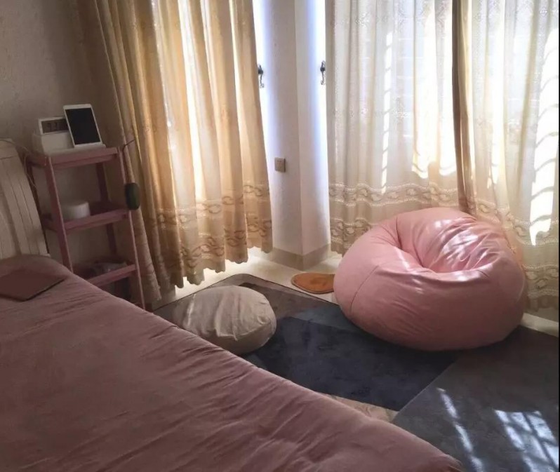 坐落在房間靠窗的角落里,背后的配上薄紗的窗簾,陽光明媚,氛圍溫馨,會不會太舒服了不想上床?