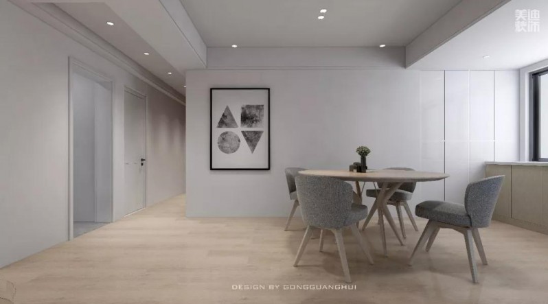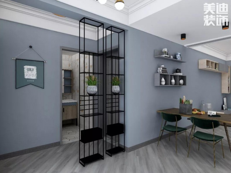 陳錦設(shè)計(jì)師在墻面上用綠植配合金屬幾何墻飾做搭配,給人簡(jiǎn)約舒適的感覺。 餐廳看向玄關(guān),玄關(guān)處做了嵌入式的儲(chǔ)物柜,不僅增加了不少收納空間,還容納了大大的冰箱,文藝清新又很實(shí)用。