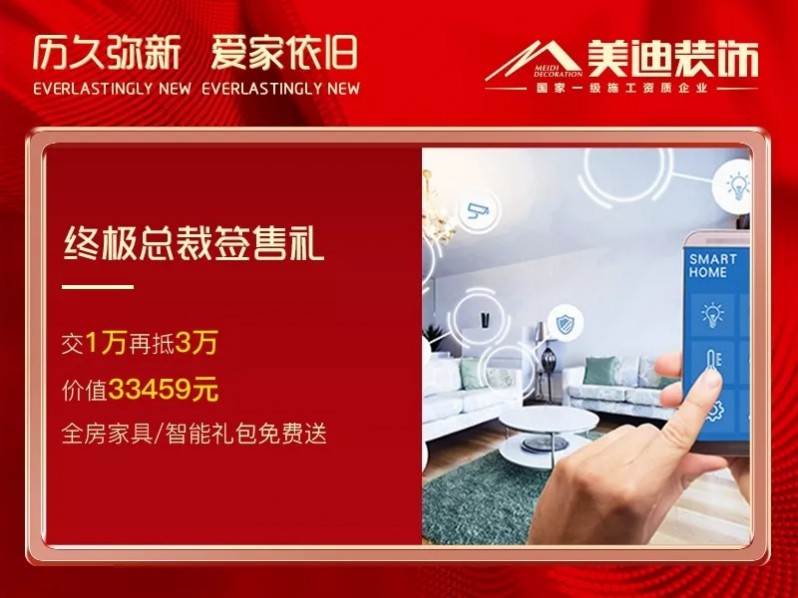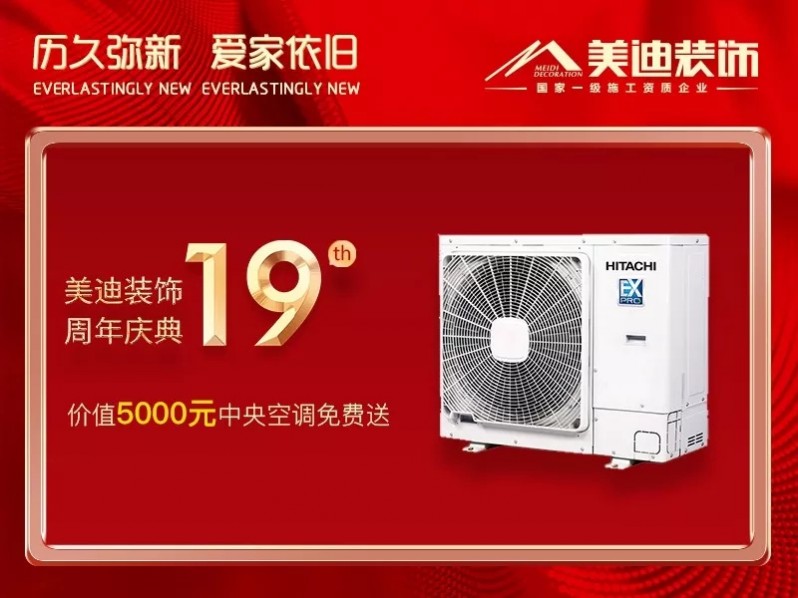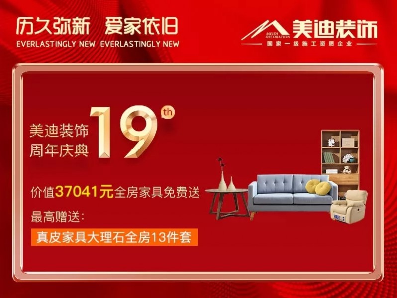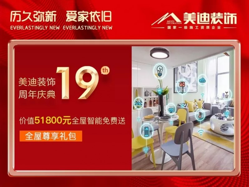 歷久彌新,愛家依舊!美迪裝飾19周年慶典5大禮包免費(fèi)送 ,5萬(wàn)元裝修優(yōu)惠大派送,全房家電免費(fèi)送、全房家具免費(fèi)送、全屋智能免費(fèi)送、品牌地暖免費(fèi)送、中央空調(diào)免費(fèi)送,一站式配齊全屋所需,省心省錢裝好家。