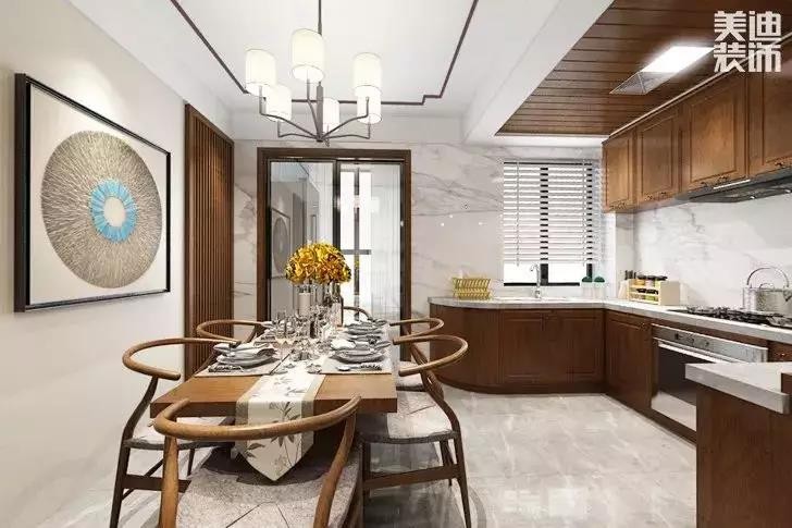 廚房選擇了開放式的廚房,餐廚一體的設計增加了家庭成員的參與和互動,母親在廚房做飯,父親和兒子在餐桌等著,這樣溫馨的場景誰不羨慕呢?