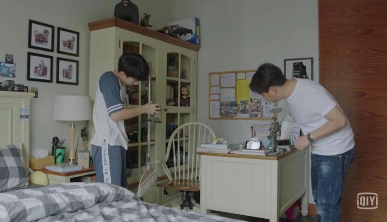 方一凡的房間是典型的男孩房間,房間搭配較為簡單,最顯眼的莫過于后面的柜子,不僅裝滿了書,還放了男孩最感興趣的各類玩具模型。