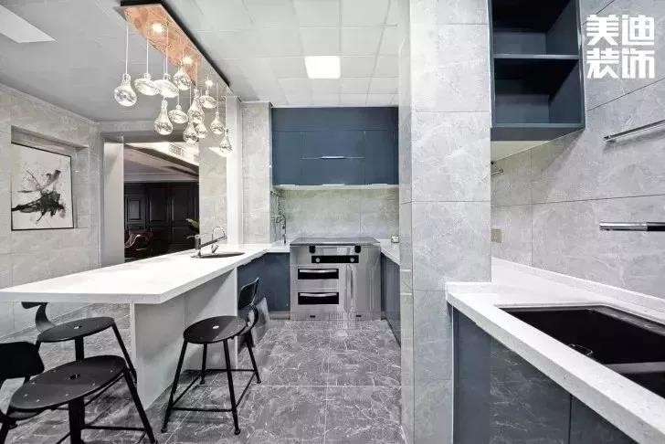 對于小戶型來說,最重要的就是視覺上的空間延伸,那么不妨考慮做成開放式廚房,這不僅省去了隔斷空間,也節(jié)約了一條動線空間。