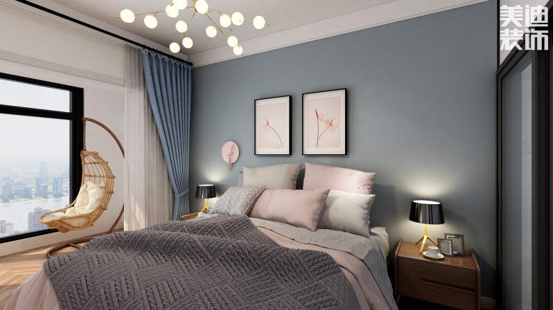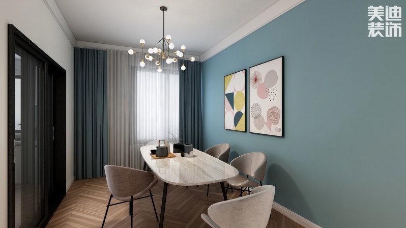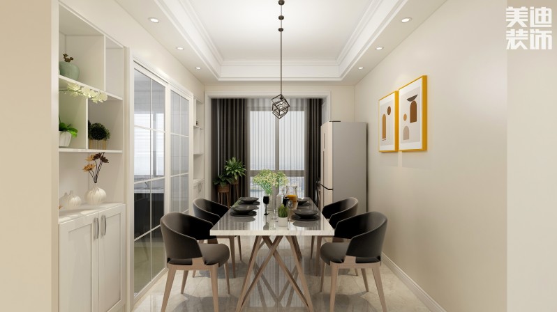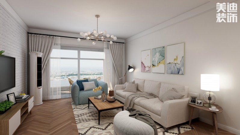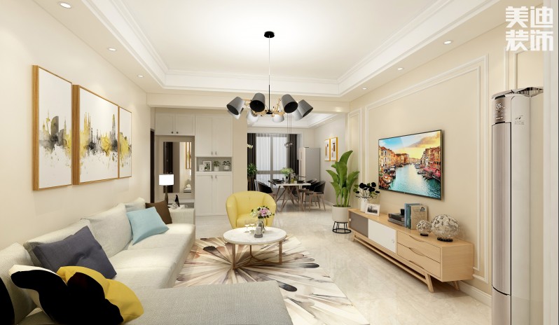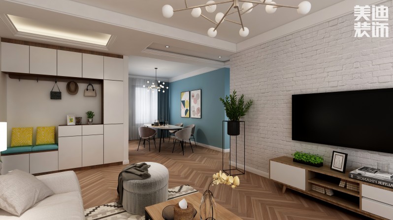 伍明君設(shè)計(jì)師在家具與裝飾的選擇上采用簡(jiǎn)約而精巧的原則,客廳吊頂?shù)脑O(shè)計(jì)結(jié)合藝術(shù)造型的吊燈,散發(fā)著北歐風(fēng)格簡(jiǎn)約的裝修風(fēng)格,再結(jié)合小綠植的搭配,為整個(gè)空間帶來了生活的氣息,讓整個(gè)區(qū)域?qū)庫o而清新。