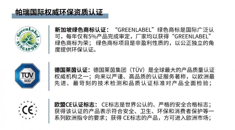 帕瑞涂料在VOC含量相關(guān)檢測中VOC含量趨0,重金屬物質(zhì)檢測中無汞、鉛等物質(zhì),符合國內(nèi)外各類檢驗(yàn)標(biāo)準(zhǔn),并取得國際多項(xiàng)權(quán)威資質(zhì)認(rèn)證。