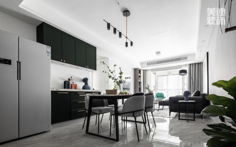 設(shè)計(jì)亮點(diǎn):中廚門往里推了40公分,把冰箱放在外面,與西廚臺形成個(gè)整體,看起來更寬敞;把餐廳的一部分做成西廚,增加功能區(qū),合理利用餐廳。刪除主衛(wèi)的多余空間來擴(kuò)大主臥空間,增加主人房的儲物能力。中廚與西廚用谷倉門區(qū)分,西廚臺面的小白磚加上大膽墨綠色柜門的設(shè)計(jì),吸引眼球。