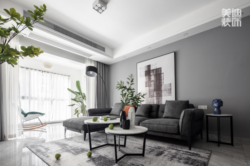 客廳整體以黑白灰作基調(diào),以原木為輔調(diào)。色彩簡單,塑造優(yōu)雅,充滿了現(xiàn)代設(shè)計(jì)感。