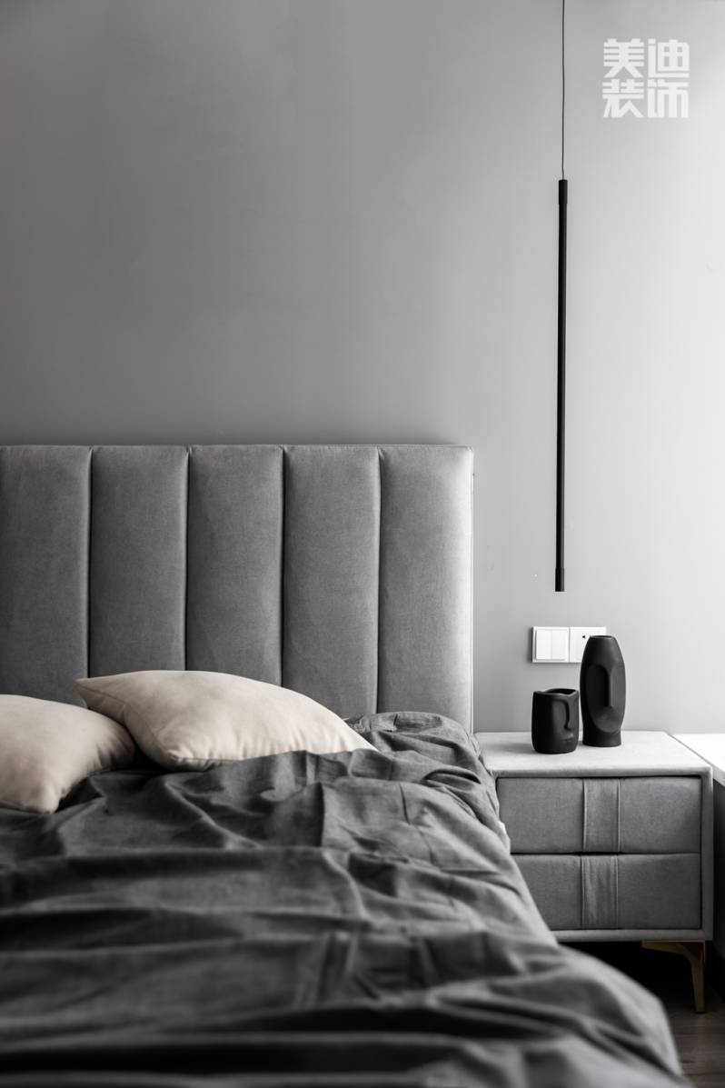 因此,主臥的墻面并沒有選擇傳統(tǒng)的白墻,而選擇了黑灰色個(gè)性肌理墻布。