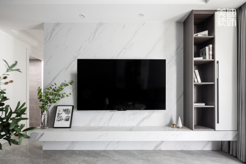 電視背景墻采用鏤空與柜門結(jié)合的儲物柜既大氣實(shí)用,又具有裝飾性。