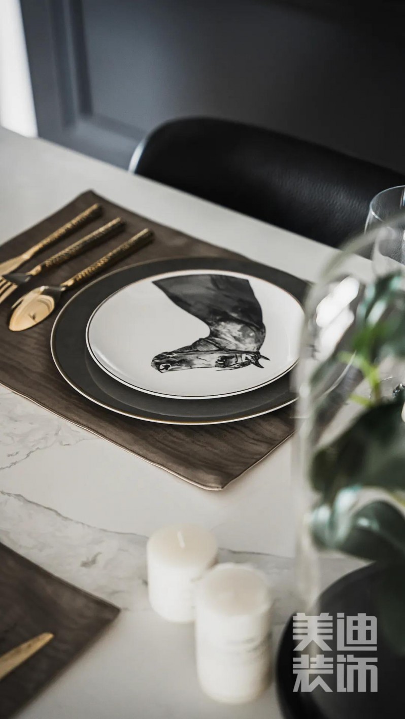 開闊明亮的廚房、餐廳占據(jù)全屋近1/3的面積,透明平開門設(shè)計(jì),隔絕油煙又通透。精致華麗的餐具,各種藝術(shù)品的加入,盡顯奢華,讓就餐也有儀式感。