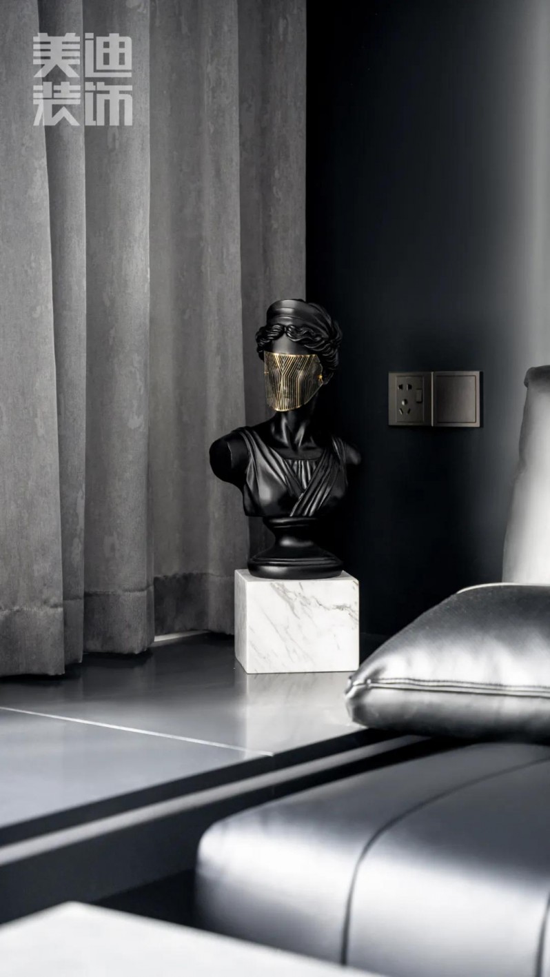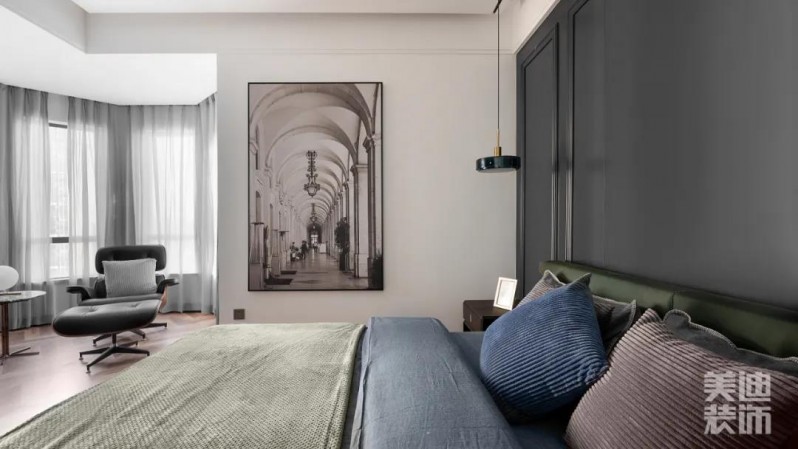 臥室黑白搭配的顏色,現(xiàn)代設(shè)計(jì)感十足的全銅吊燈垂于床頭兩側(cè),精致奢華,莫蘭迪色床品清新舒適感滿滿,白色背景墻上的晶瓷裝飾畫,整個(gè)空間被藝術(shù)感包圍。
