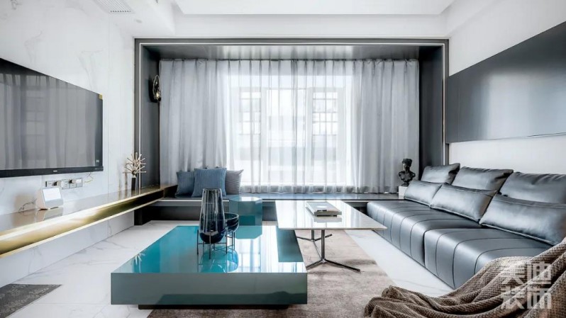 采用高低組合式的大理石茶幾,視覺(jué)上形成落差,藍(lán)色與白色長(zhǎng)方形的錯(cuò)落設(shè)計(jì),滿足不同的多樣化需求,同時(shí)更與沙發(fā)形體相呼應(yīng),整體結(jié)構(gòu)呈現(xiàn)出一種工整、理性的直線感、層次分明。