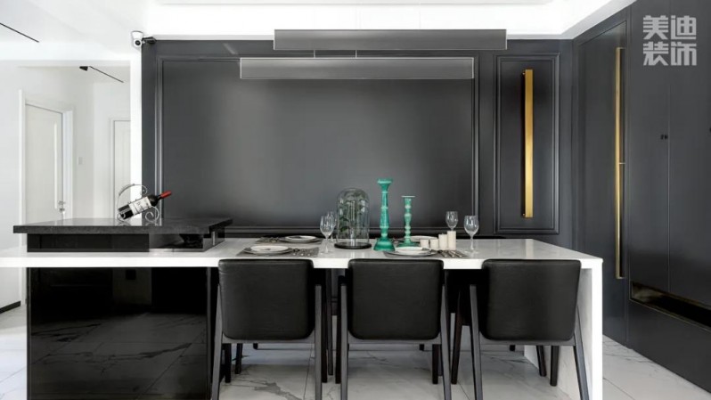 熱情好客的業(yè)主打造了一個(gè)近10平米的超大半開放U型廚房,開闊又通透,客餐廳一體化,延伸視覺(jué)形成了一個(gè)長(zhǎng)且敞亮的空間,簡(jiǎn)單又不乏設(shè)計(jì)感,定制4mX2m大理石餐桌,可同時(shí)容納15人就餐,純白色桌面搭配黑色餐椅,大氣又高級(jí)。