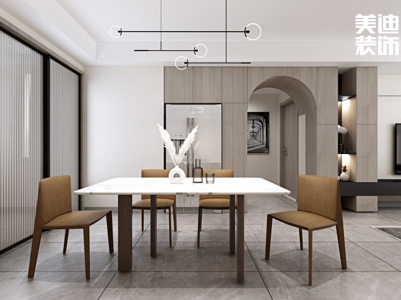 沒(méi)有空間設(shè)置玄關(guān)柜,怎么辦?直接順著墻壁在餐廳這里做一個(gè)柜子隔斷,使大門處形成一個(gè)過(guò)道式的玄關(guān),另一側(cè)則是餐廳。這樣一來(lái),不僅玄關(guān)有了,柜子的收納能力也是杠杠的,而且還順帶遮擋了餐廳空間,保持了私密性。