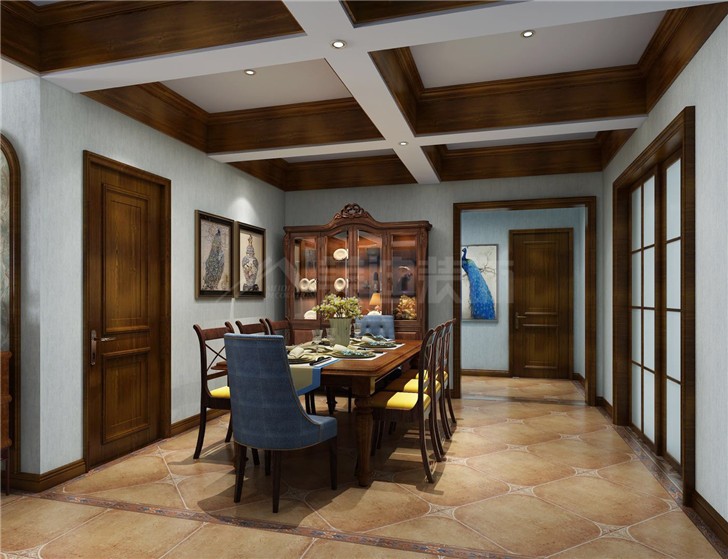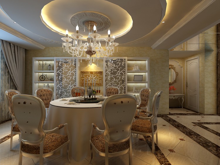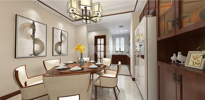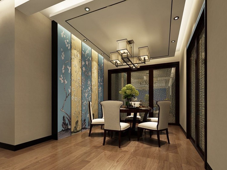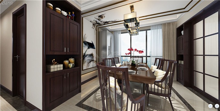 用鏤空式屏風(fēng)做玄關(guān)隔斷,不僅可以提亮空間,延展空間視覺效果,增加空間的通風(fēng)性,而且在屏風(fēng)上還可以放置東西,增加空間的收納功能。整個餐廳顯得和諧寧靜。