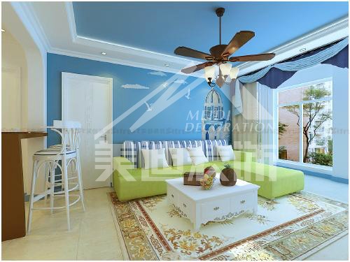 通過以海洋的蔚藍(lán)色為基色調(diào)的顏色搭配方案,自然光線的巧妙運(yùn)用,富有流線及夢(mèng)幻色彩的線條等軟裝特點(diǎn)來表述其浪漫情懷。