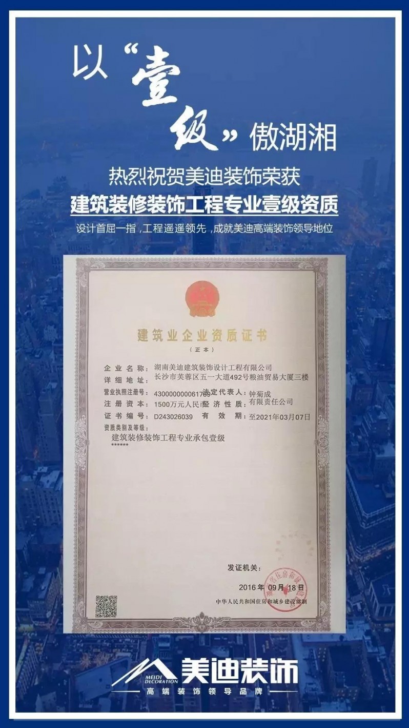 美迪裝飾擁有住建部頒發(fā)的國家一級施工資質(zhì)企業(yè)(湖南唯一),獨(dú)家研發(fā)4項(xiàng)家裝精湛工藝,擁有17余年家裝經(jīng)驗(yàn)工程團(tuán)隊(duì)匠心打造。